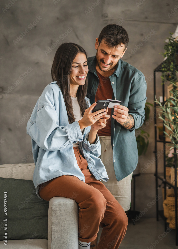 Adult caucasian couple buy online on mobile phone with credit card