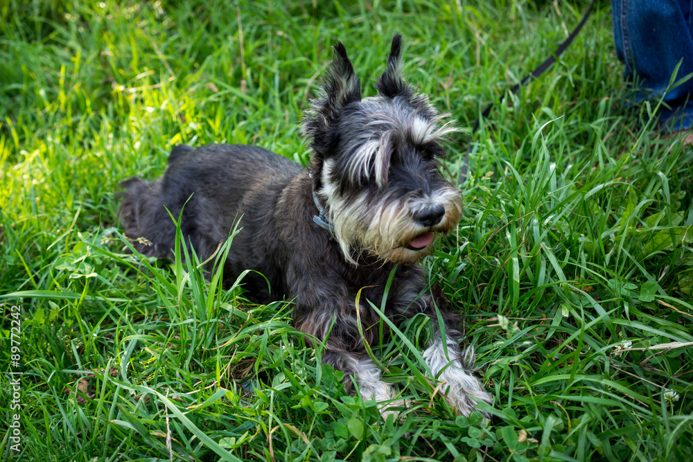 miniature black and silver schnauzer laying in the grass