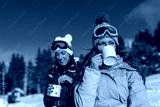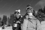 Friends enjoying a winter day on the mountain, sipping tea and embracing the snowy landscape. They are bundled up in warm clothes, laughing and having fun in the crisp mountain air