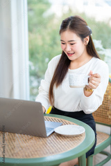 Happy of asian freelance people business female casual working with laptop computer and holding a coffee and smartphone in coffee shop like the background,communication concept