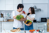 Happy portrait of loving young asian of having fun standing a cheerful preparing food and enjoy cook cooking with vegetables, meat, bread while standing on a kitchen Condo life or home