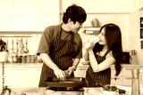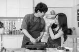 Happy portrait of loving young asian of having fun standing a cheerful preparing food and enjoy cook cooking with vegetables, meat, bread while standing on a kitchen Condo life or home