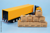 Cargo truck and heap of carton boxes on blue background. Transportation and move concept.
