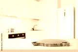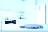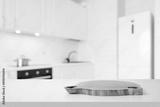 Wooden podium on white table with free space and blurred modern kitchen interior background