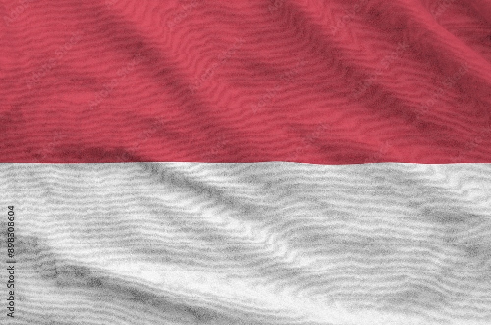 Monaco flag depicted on folded wavy fabric of old cloth close up