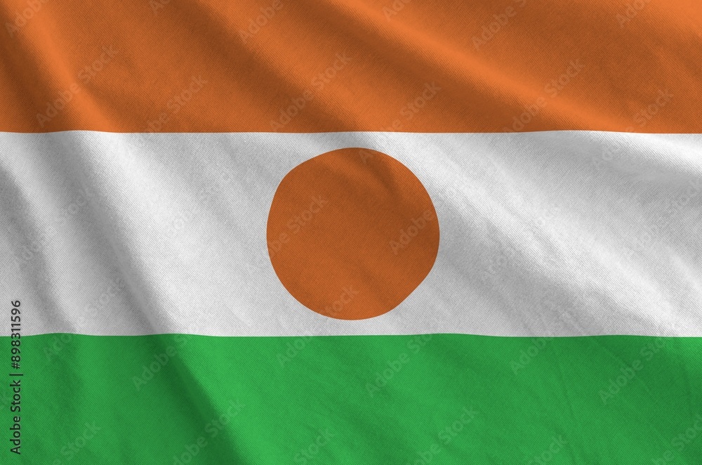 Niger flag depicted on folded wavy fabric of old cloth close up