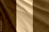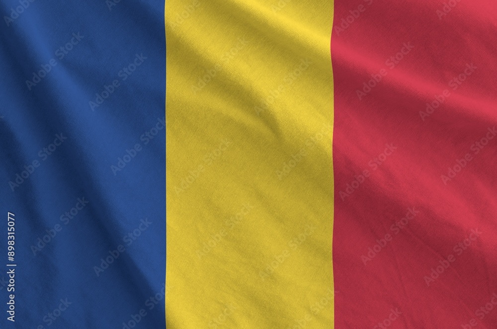 Romania flag depicted on folded wavy fabric of old cloth close up