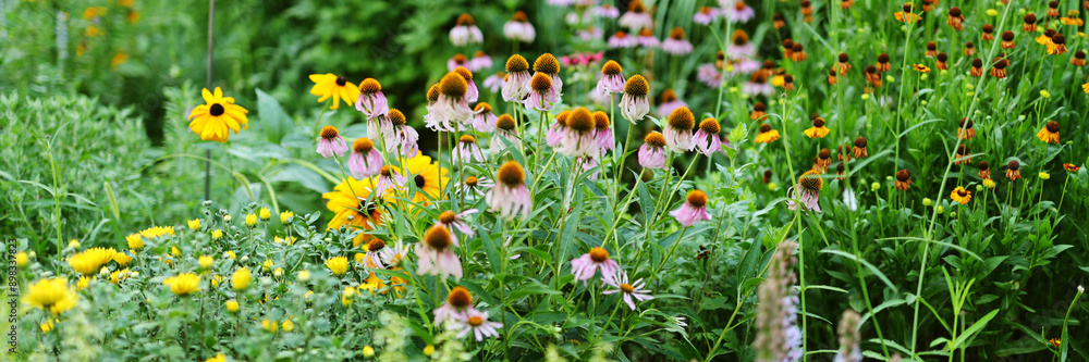 A garden with a variety of flowers including yellow and purple. The flowers are in full bloom and the garden is lush and green