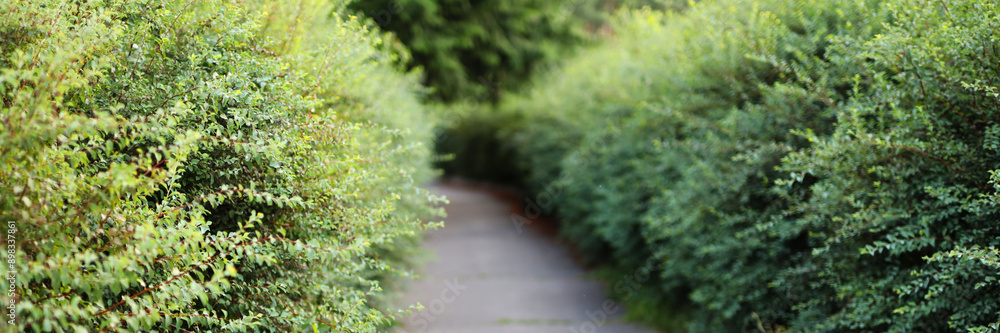 A path through a hedge with a view of the sky. The path is lined with bushes and the sky is clear and blue