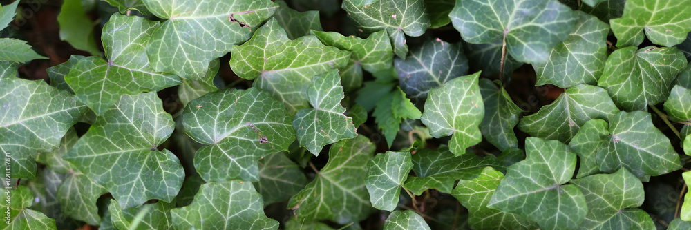 A bunch of green ivy leaves are growing on the ground. The image has a peaceful and calming mood, as the leaves are growing in a natural setting
