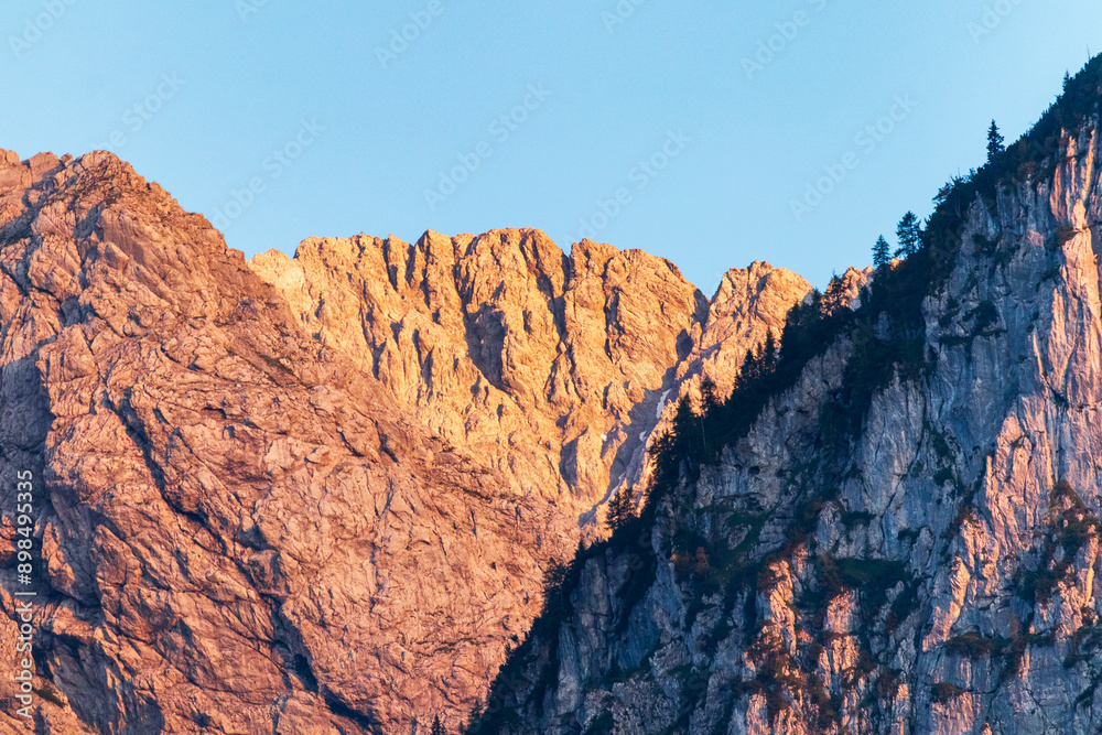 A majestic mountain landscape bathed in the warm glow of sunrise or sunset. The rugged, jagged peaks of the mountain range are illuminated, casting long shadows across the valleys.