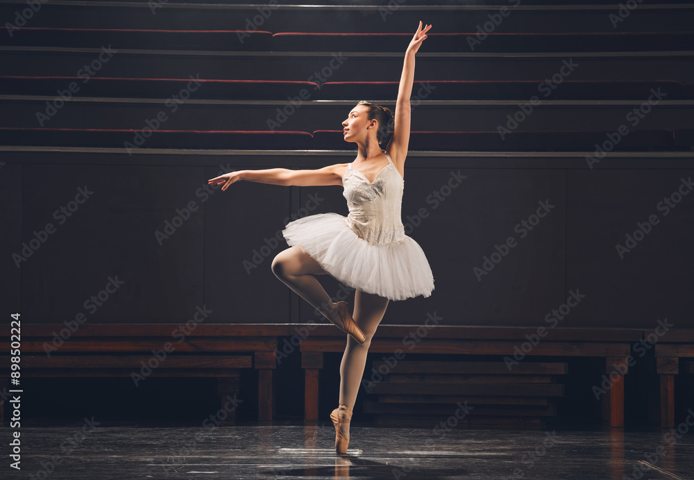 Woman, ballet and artist for dance on stage, creative and practice performance in rehearsal. Female person, dancer and movement for physical talent at academy, student and routine training at theatre