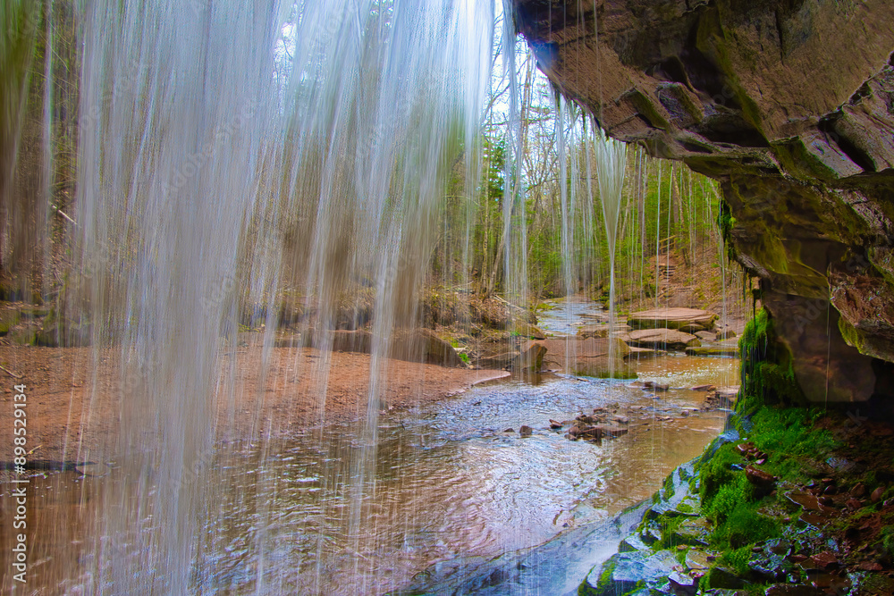 Landscape of a small waterfall viewed from behind as it cascades into Lost Creek in a peaceful forest on an early Spring day near Cornucopia, Wisconsin.