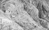 Layered rock formations featuring gray and orange hues with intricate geological textures and patterns