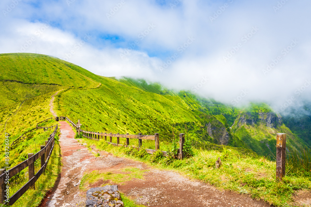 Path along volcano crater green valley caldera, Faial island, Azores, Portugal