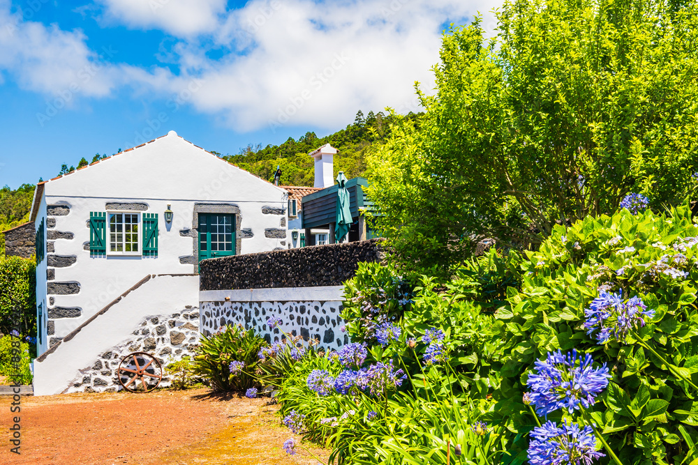Traditional house and garden with tropical plants near Varadouro village, Faial island, Azores, Portugal