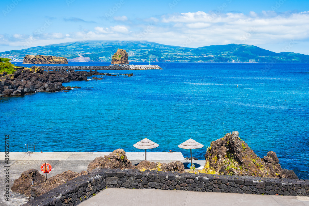 Beach with umbrellas on coast of Pico island with view of Faial island in background, Azores, Portugal