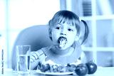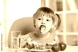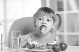 Cute little girl eats vegetable salad using fork