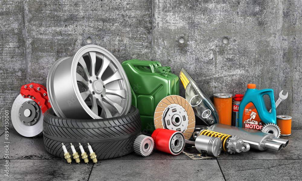 Auto parts on concrete wall. Auto service.