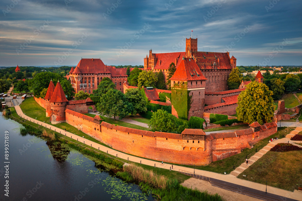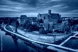Castle of theTeutonic Order in Malbork by the Nogat river at sunset.