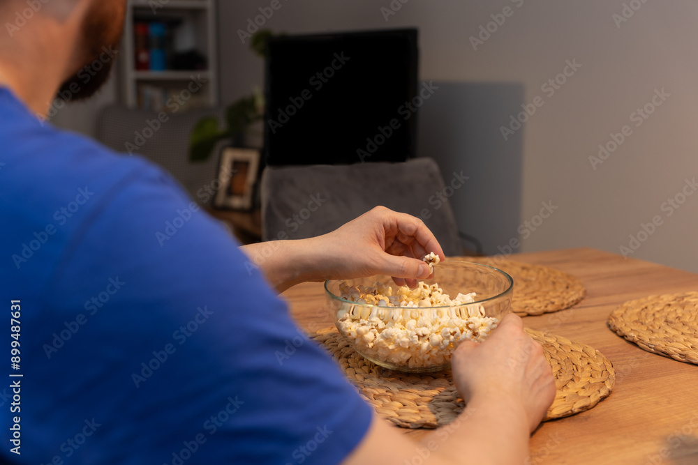 man watching streaming TV while eating popcorn that is on the table, concpet specdzania leisure time