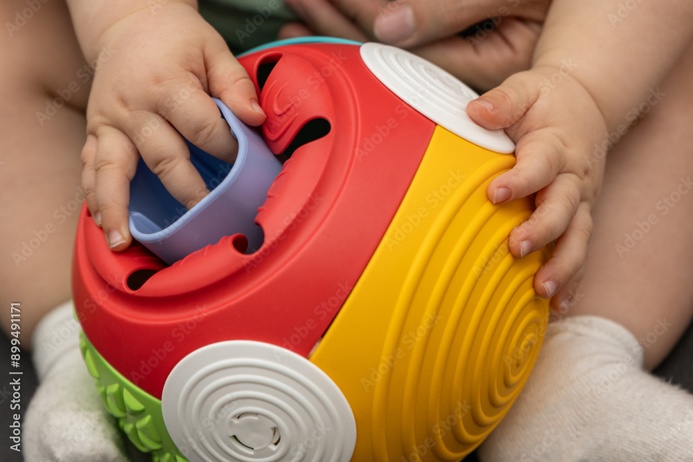 The infant tries to place a block in the multicolored ball. The baby's hands hold the toy, and the block fits into the correct hole. The ball has different colors and textures, mainly red, yellow and