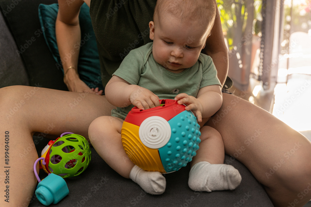 A small child is trying to place a block into a colorful ball, while the mother offers subtle guidance, transforming it into a learning moment that introduces sensory exploration and encourages imagin