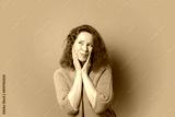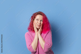 Woman with pink hair portrait, female with curly hair, positive emotion style.