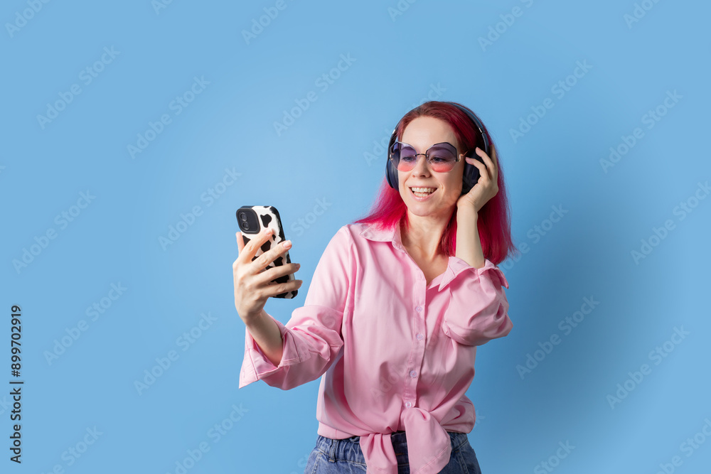 Woman with pink hair dancing with phone and headphones on blue background, listening to songs on mobile, smiling and enjoying leisure, feeling happiness and relaxation.
