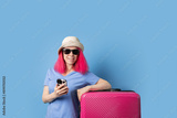 Woman with pink hair in hat with suitcase and mobile phone on blue background, traveler booking a hotel online, girl using smartphone for reservations, person planning a vacation.