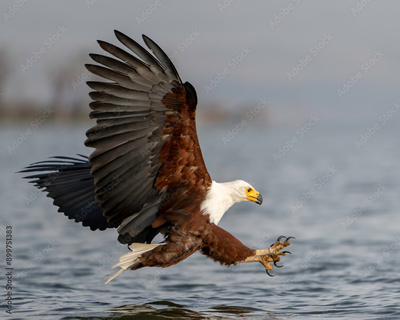 An African fish Eagle (Icthyophaga vocifer) in flight, Lake Naivasha Kenya, Africa