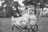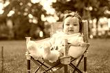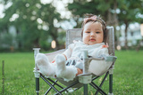 Happy asian baby kid sitting on picnic chair in public park on the green grass in outdoor vacation summer, Happy family