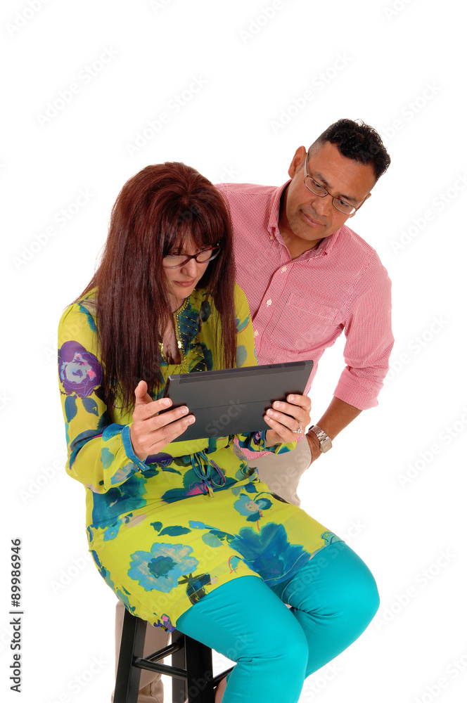 Husband and wife looking at there tablet.