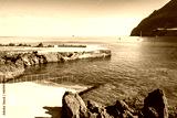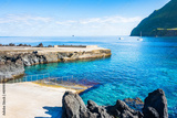 Idyllic bay with rocks and beach on ocean coast in Faja Grande village, Flores island, Azores, Portugal