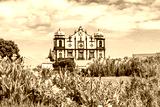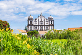 Church in Saota Cruz das Flores town with yellow flowers in foreground, Flores island, Azores, Portugal