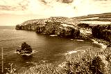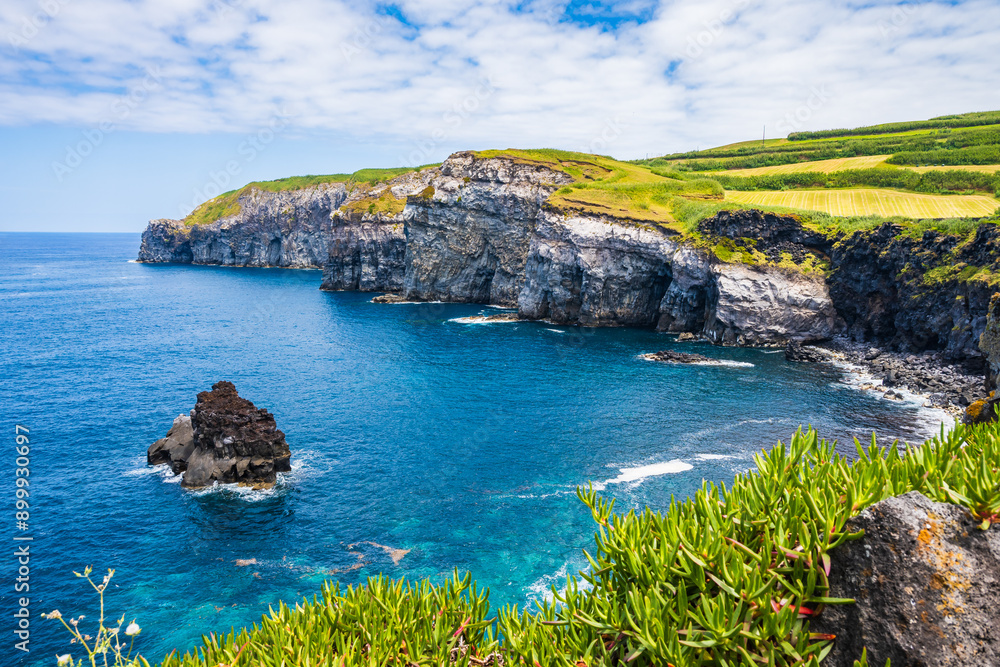 Rocks in blue ocean with green tropical plants on coast of Sao Miguel island at Ribeirinha lookout, Azores, Portugal