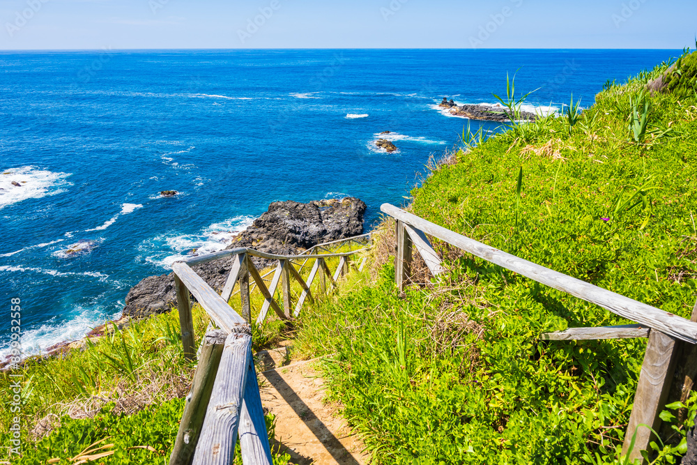 Path to beach on ocean coast near Maia village, Sao Miguel island, Azores, Portugal