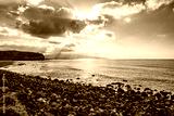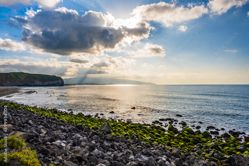 Bay with stones on beach at sunset time in Ribeira Grande town, Sao Miguel island, Azores, Portugal