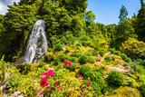 Waterfall in tropical gardens with flowers and exotic plants in Ribeira do Caldeiros park, Sao Miguel island, Azores, Portugal