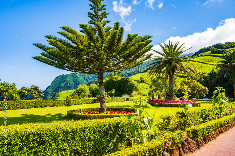 Exotic trees in tropical gardens with flowers in Ponta do Sossego park, Sao Miguel island, Azores, Portugal