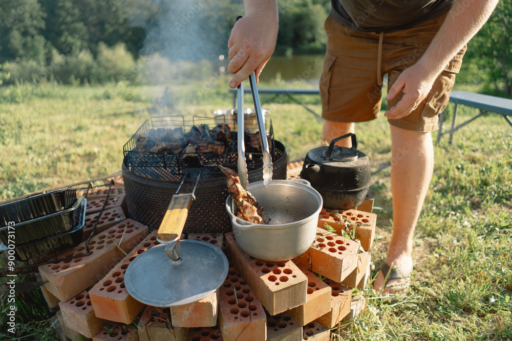 A man stands in nature, preparing meat on a makeshift grill built from bricks. He uses tongs to transfer the food from the grill to a pot. Tourist on recreation outside. Campsite lifestyle