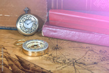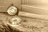 Vintage pocket watch and compass on old map background