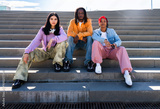 Young group of multiethnic hip-hop dancers wearing colorful urban streetwear dancing - Stylish multiracial rap crew portrait in the city