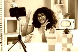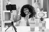 Beautiful young hispanic woman with curly hair portrait at home - Happy teenager influencer streaming live on social media with her mobile phone
