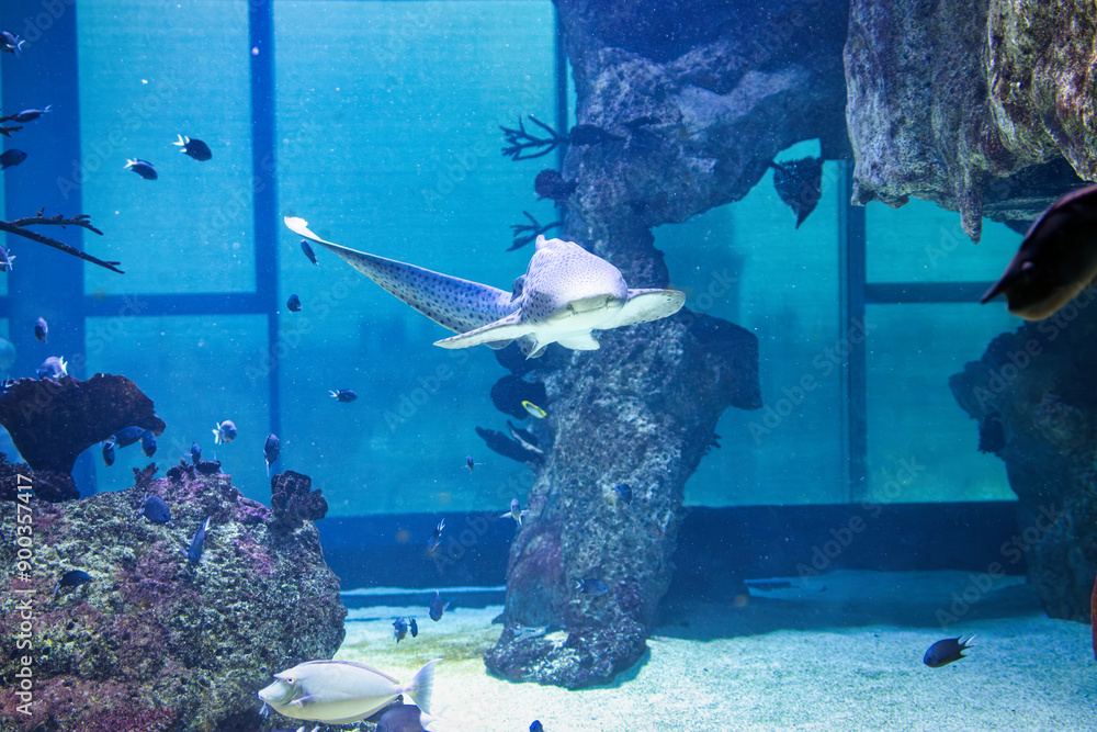 Leopard Shark (Stegostoma fasciatum) Swimming Gracefully in Aquarium with Vibrant Blue Water and Marine Life