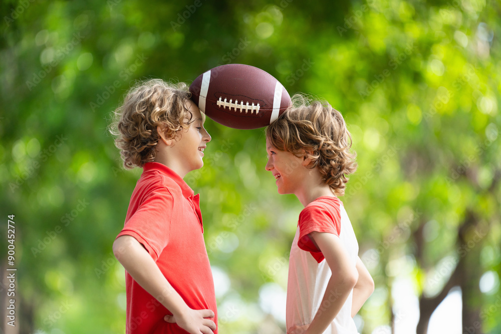 Family playing American football. Kids play rugby