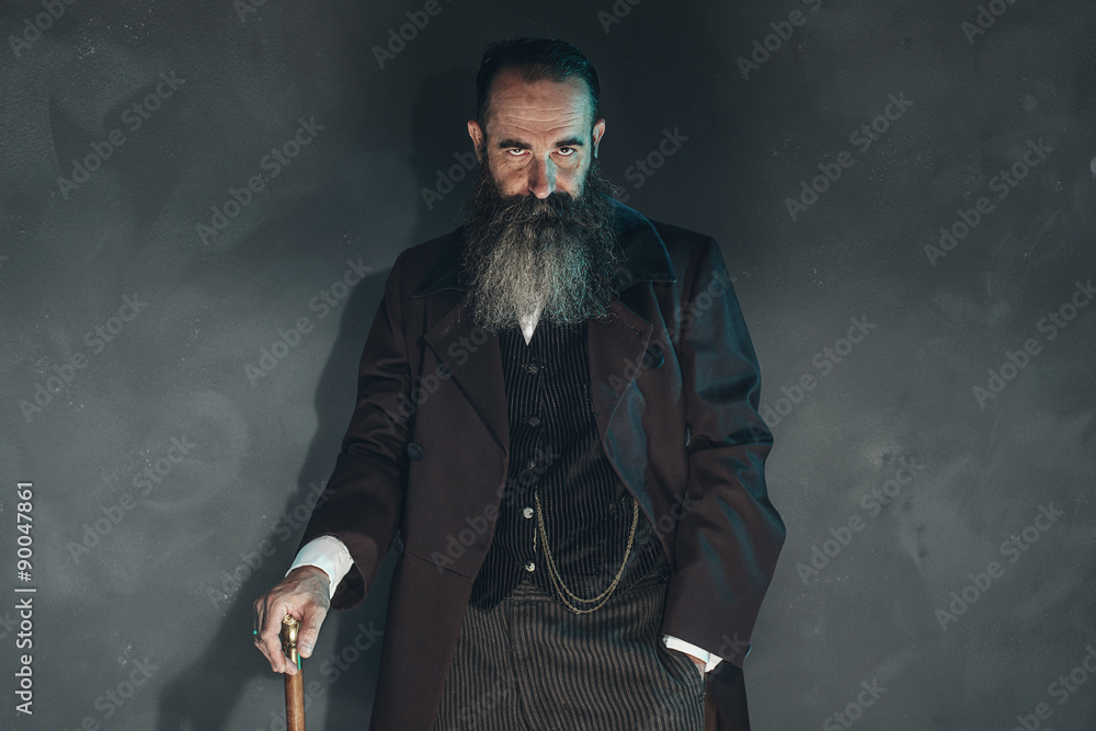 Mysterious vintage beard man in 1900 style fashion with cane aga