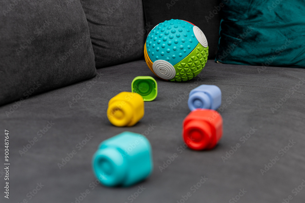 Exercise ball for toddlers with scattered blocks for baby, educational concept for the youngest