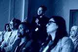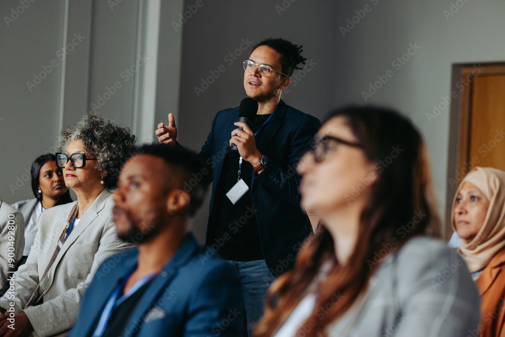Businessman asking question during diverse conference workshop presentation