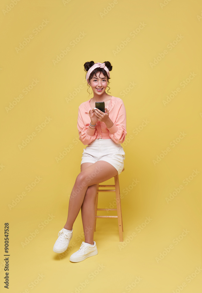 Young woman asian happy smiling. While her using mobile phone sitting on chair isolated on yellow background.